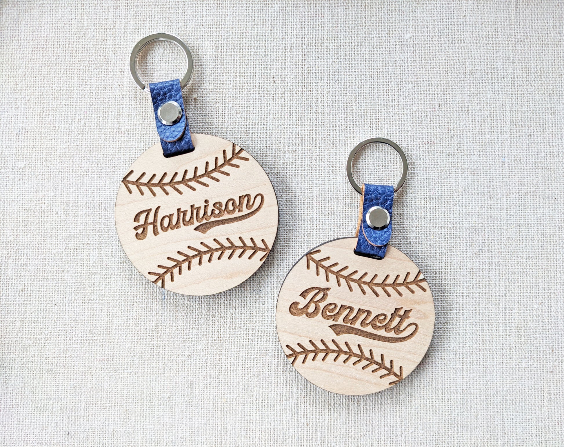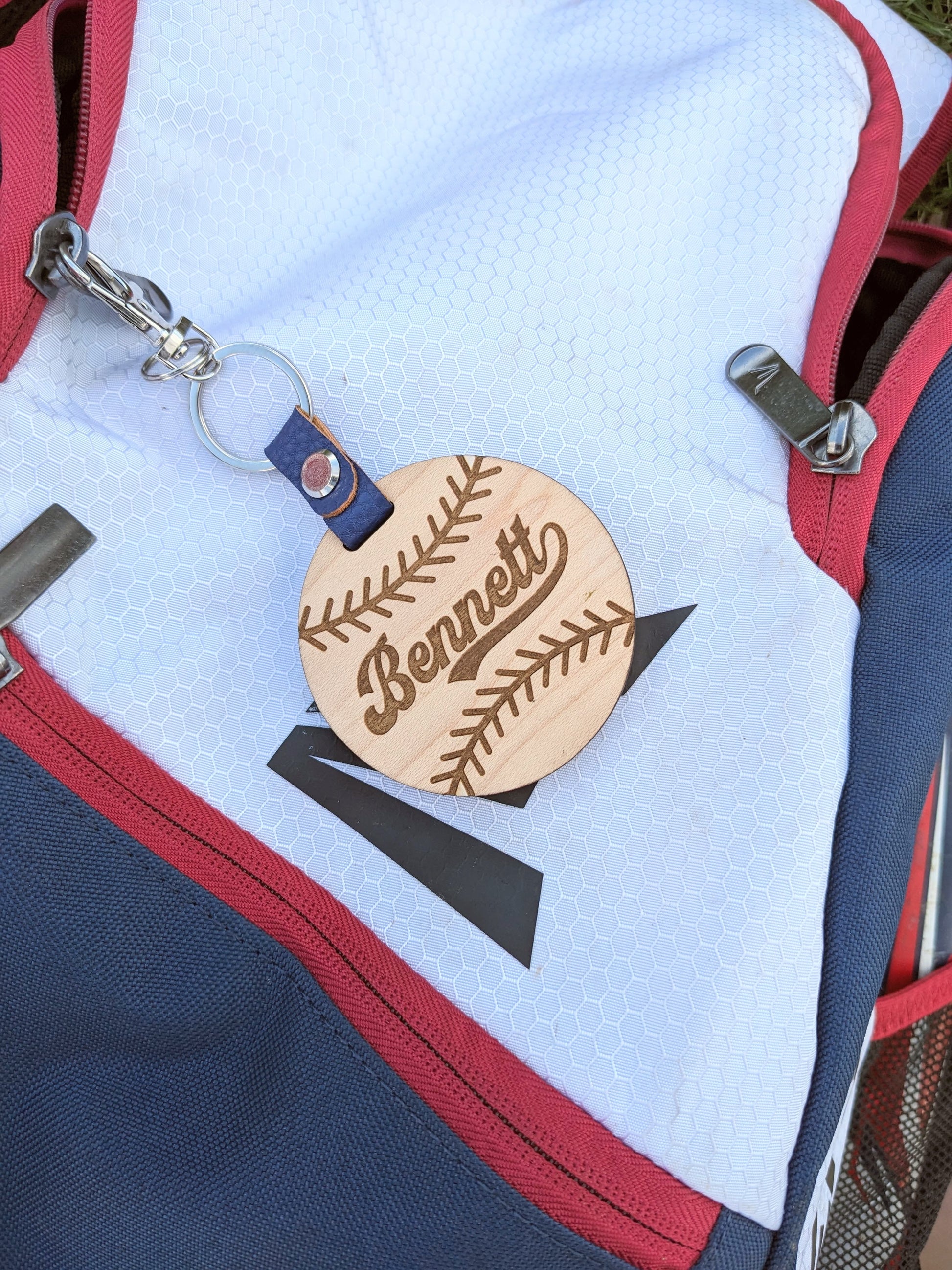 Find your kid's bag faster at the end of each game with a custom baseball bag tag. Made of 1/4" wood, this tag is engraved with your player's name and is accented with a royal blue faux leather keychain assembly.