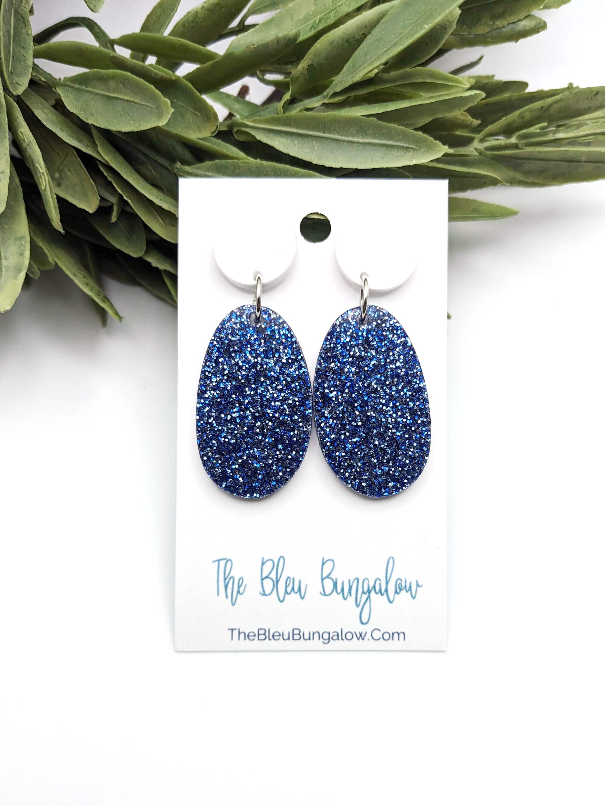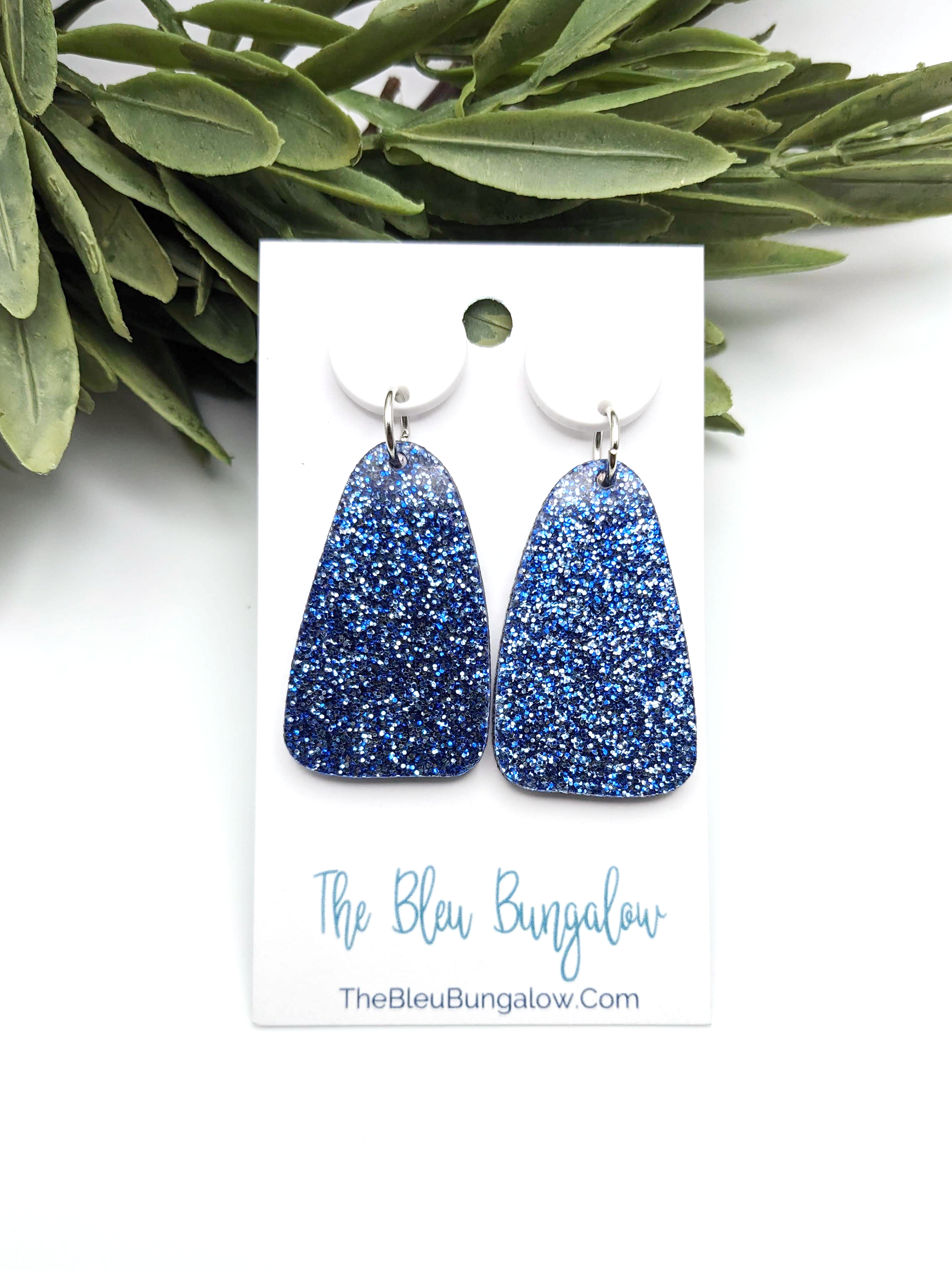 These earrings are made with blue glitter acrylic and a white stud topper, and they measure approximately 2-2.5" from top to bottom (hardware included). Choose from two different styles.
