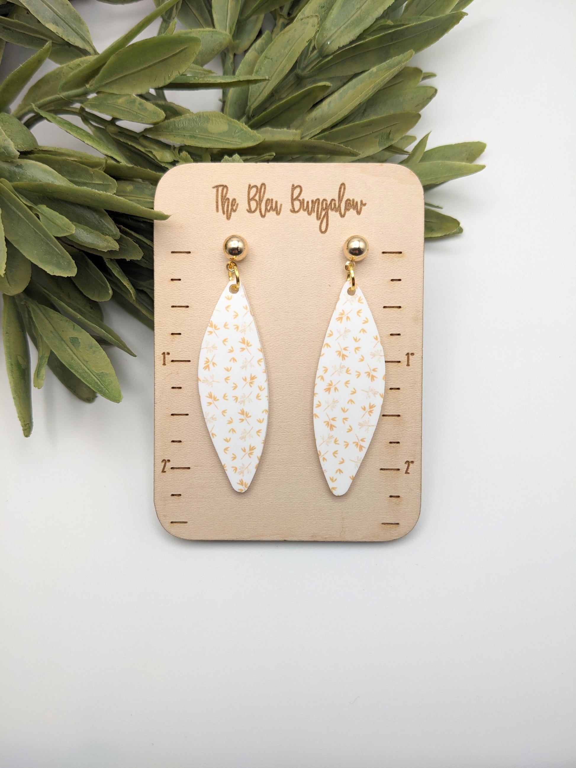 Add a bright pop to your outfit with these custom printed acrylic earrings featuring a delicate yellow and white floral pattern.