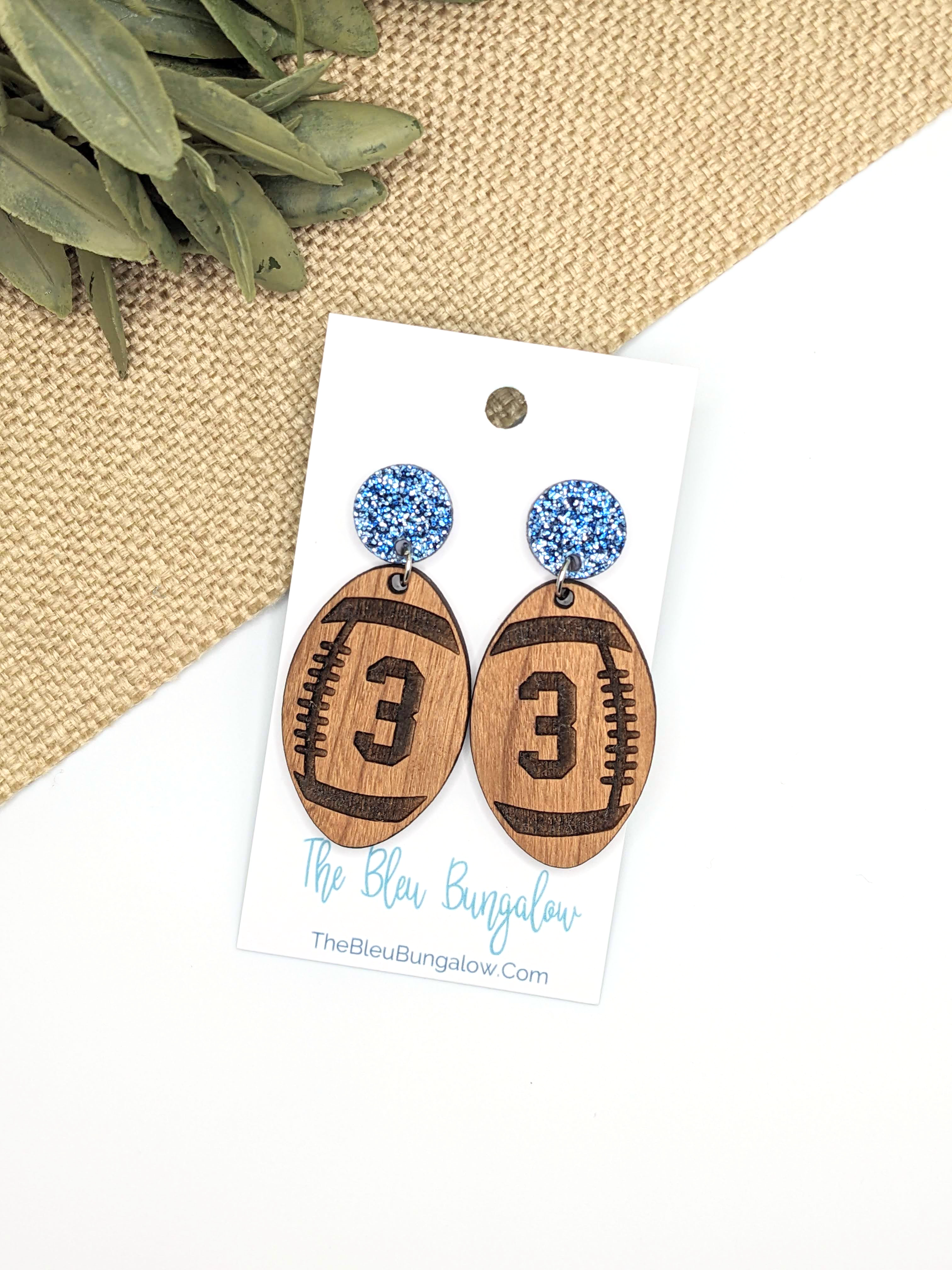 These custom, made-to-order earrings feature an engraved football with your player's number and are accented with a glitter blue acrylic stud topper. Have more than one Spartan in the game? Wear a different number on each ear or ask about putting two numbers on the football!