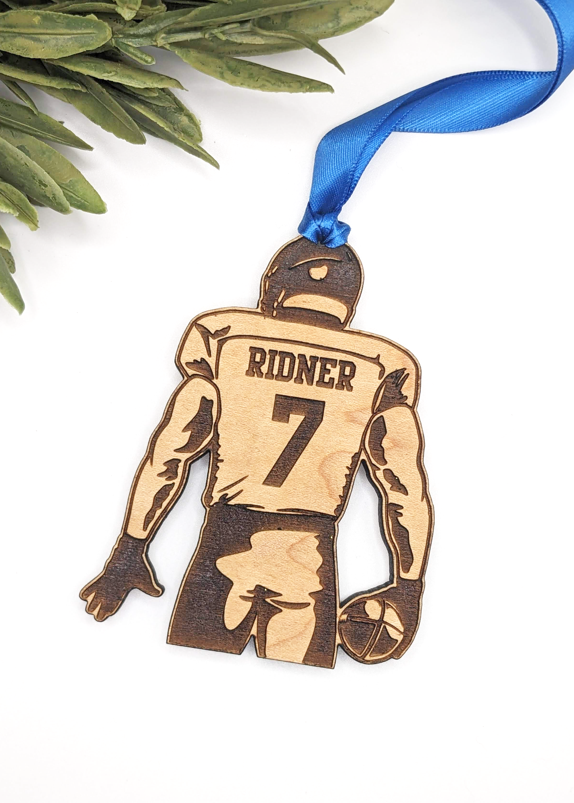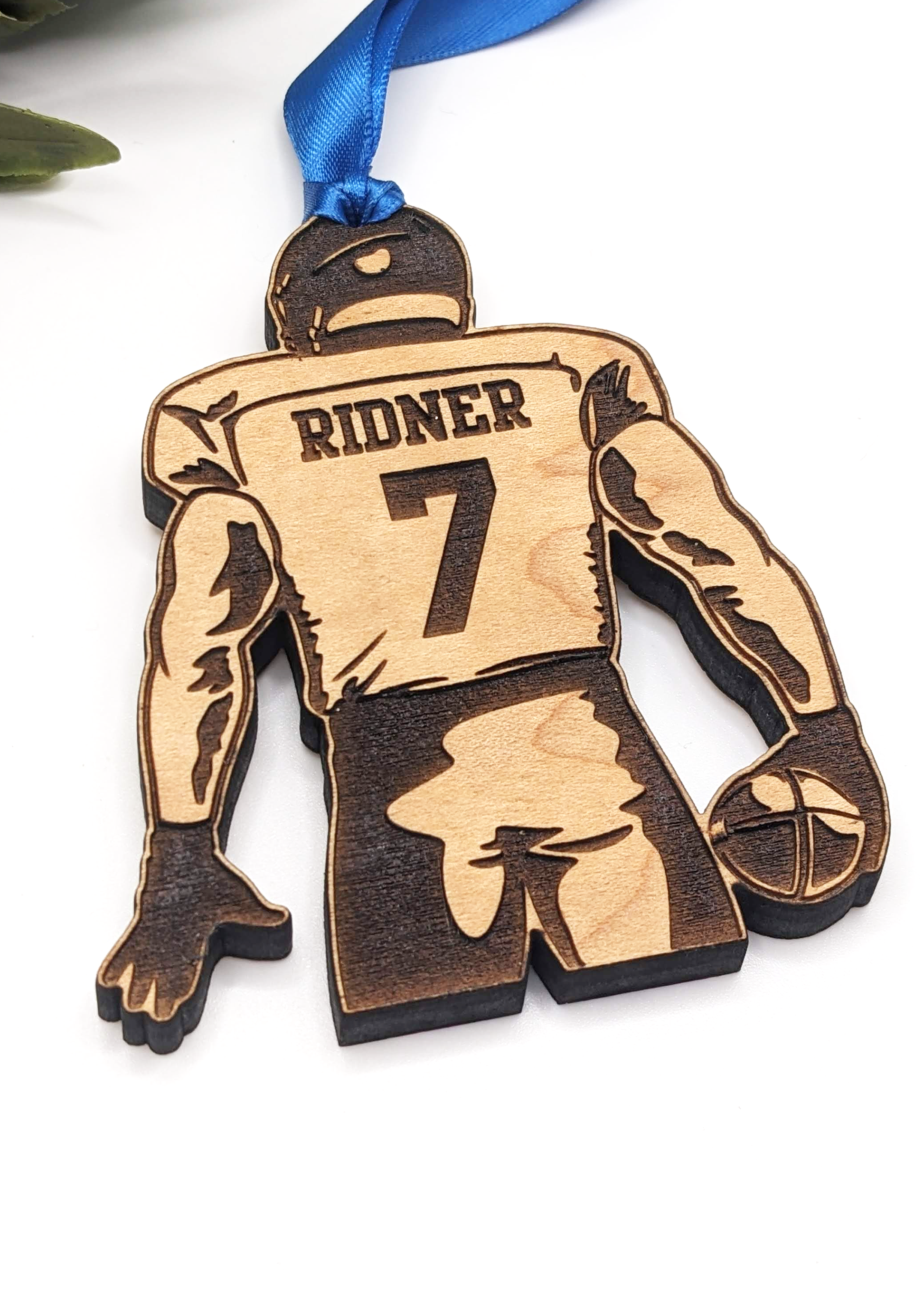 Featuring the back of a uniformed football player, each ornament is personalized with your player's last name and number, and is accented by a length of royal blue ribbon.