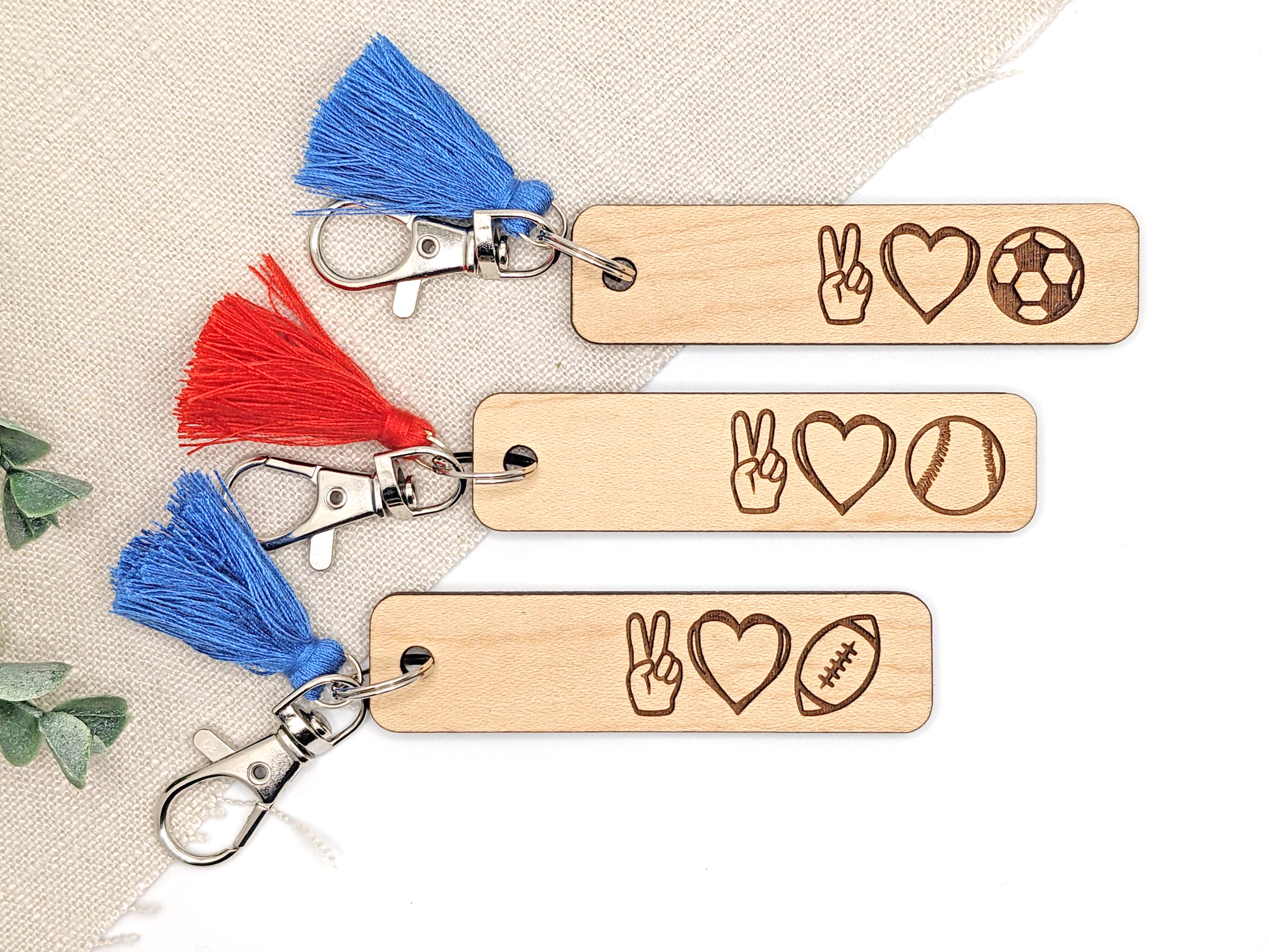 These wooden keychains are made of 1/8" plywood and are accented with a small tassel.