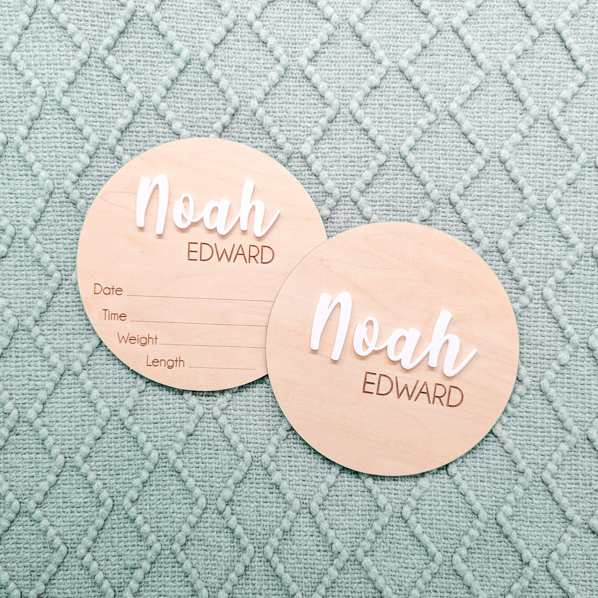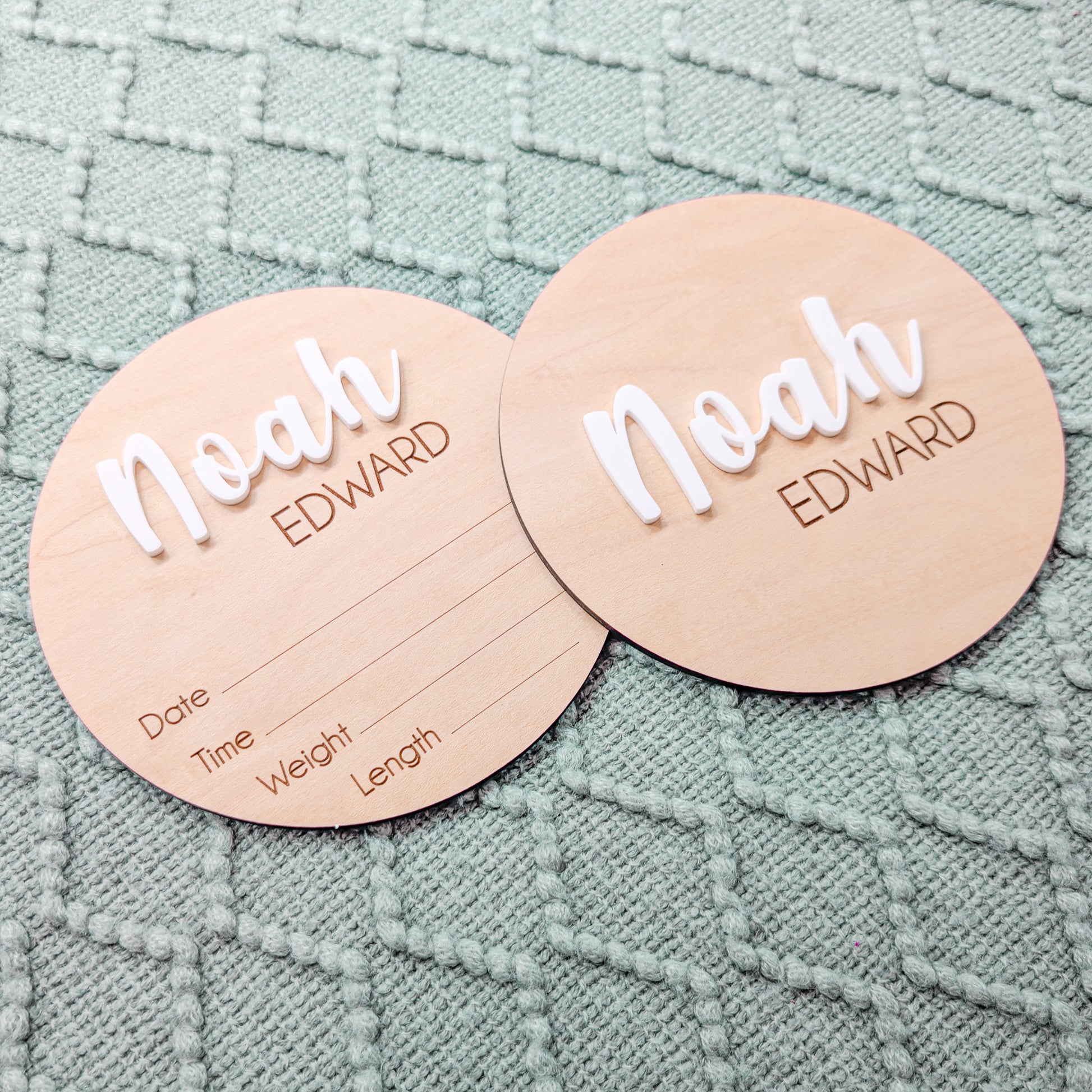 Made of 1/8" maple and white acrylic, this 2 piece set is customized with a first and middle name, with one round containing additional places to enter the birth date, time, weight and length of your little one.