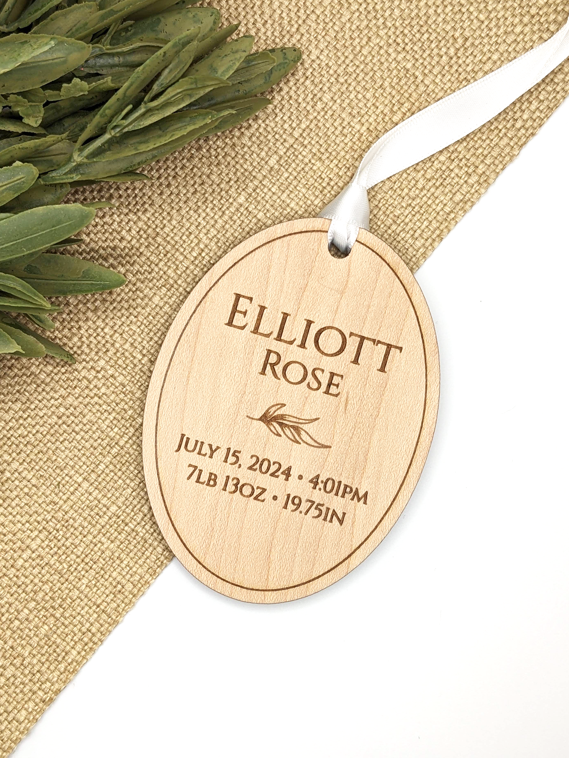 This ornament is made from 1/4" maple and is customized with a first and middle name, followed by the birth date, time, weight and length of your little one.