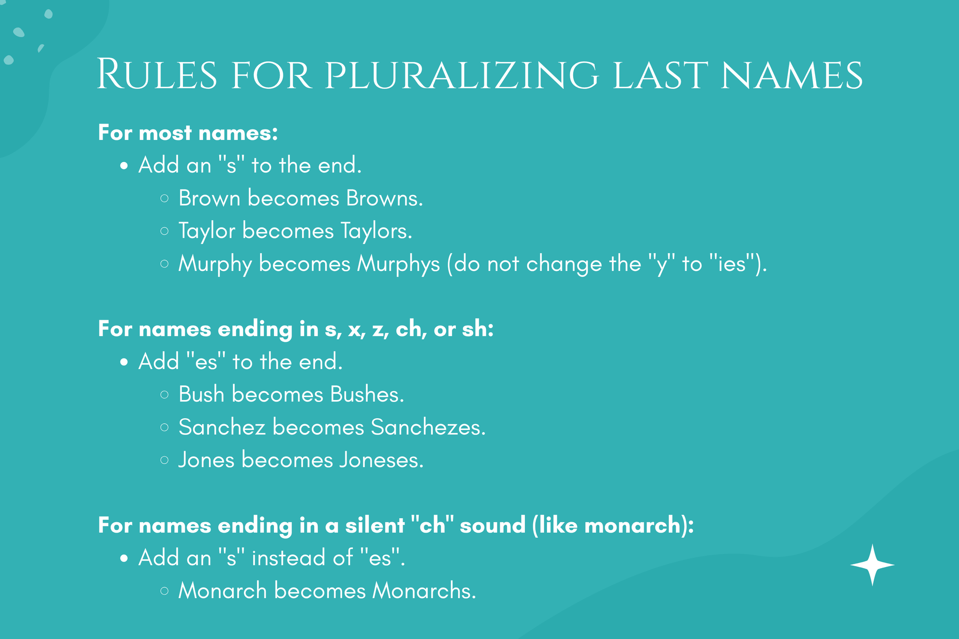 - Murphy becomes Murphys (do not change the "y" to "ies").