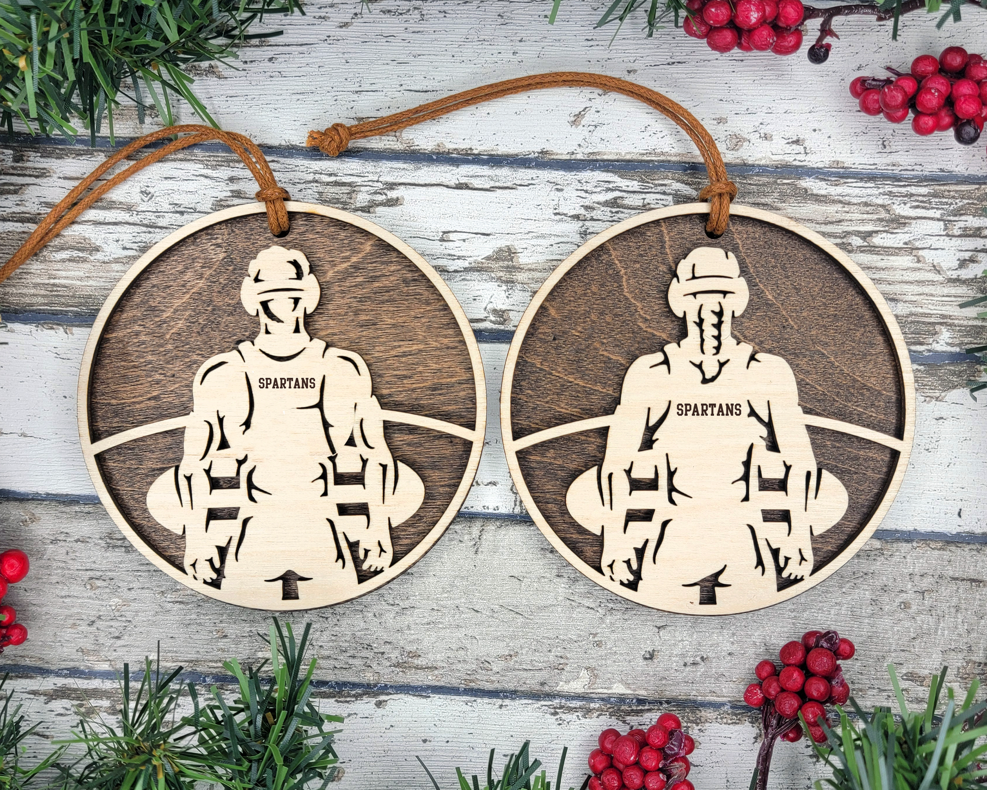 Pick your wrestler's silhouette and then choose from two different material types (blue and white MDF with blue/white twine or natural wood with brown cord). Note the ornament shown is natural wood with brown cord.